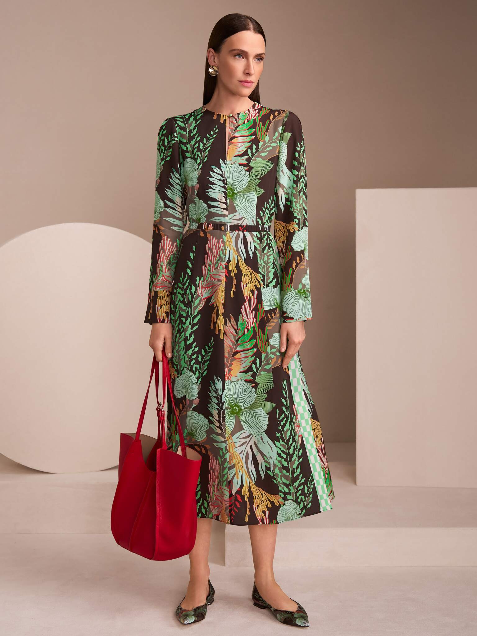 Растительный принт по всей поверхности ткани придаёт образу динамику и добавляет выразительности, сохраняя при этом утончённость.