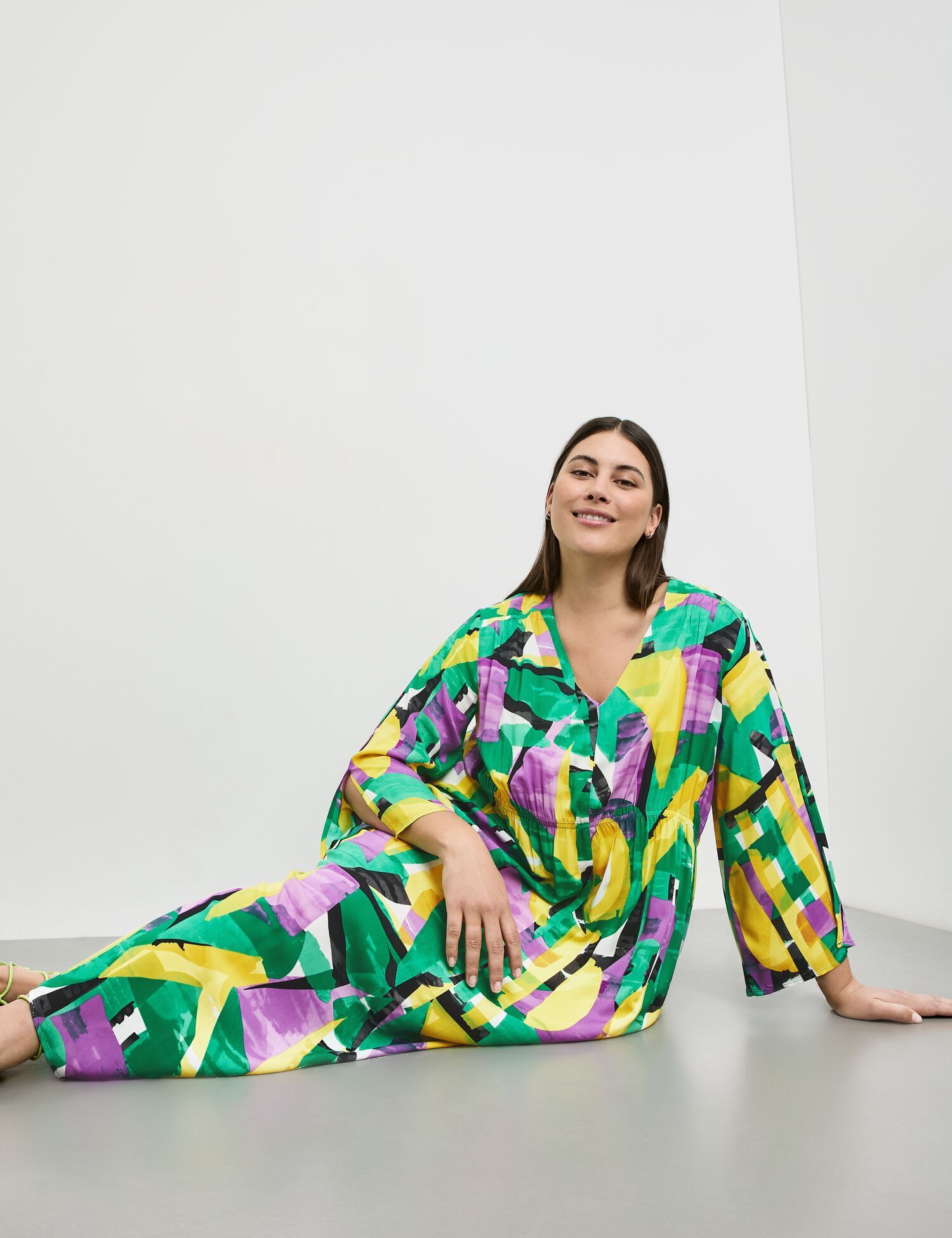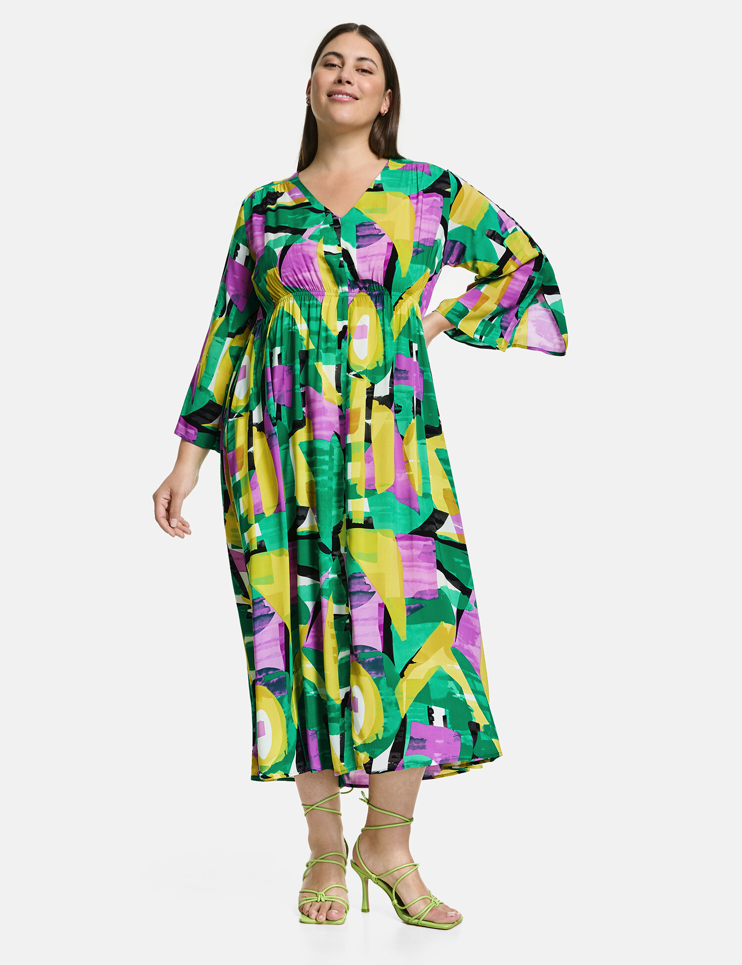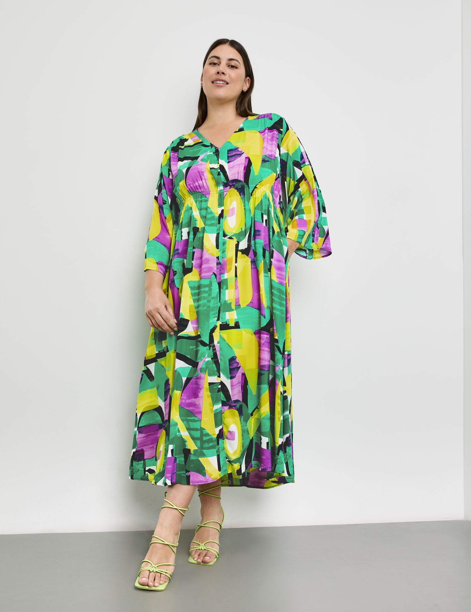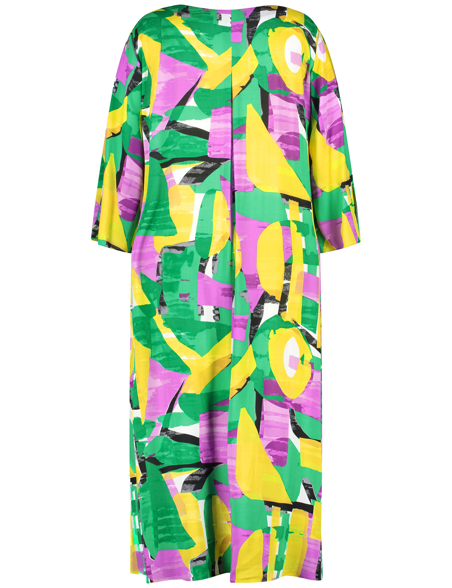 Платье из эковискозы с выразительным абстрактным узором в зелёных, жёлтых, чёрных и фиолетовых тонах — для тех, кто хочет выделяться стильно и с комфортом. Прямой, слегка свободный крой дополнен эластичной вставкой на талии, которая красиво формирует силуэт и подчёркивает фигуру без стеснения движений. Рукава длиной 3/4 с разрезами придают лёгкость образу, а отсутствие застёжек делает посадку особенно удобной. Идеально подойдёт для летнего дня, прогулок или неформальных встреч.